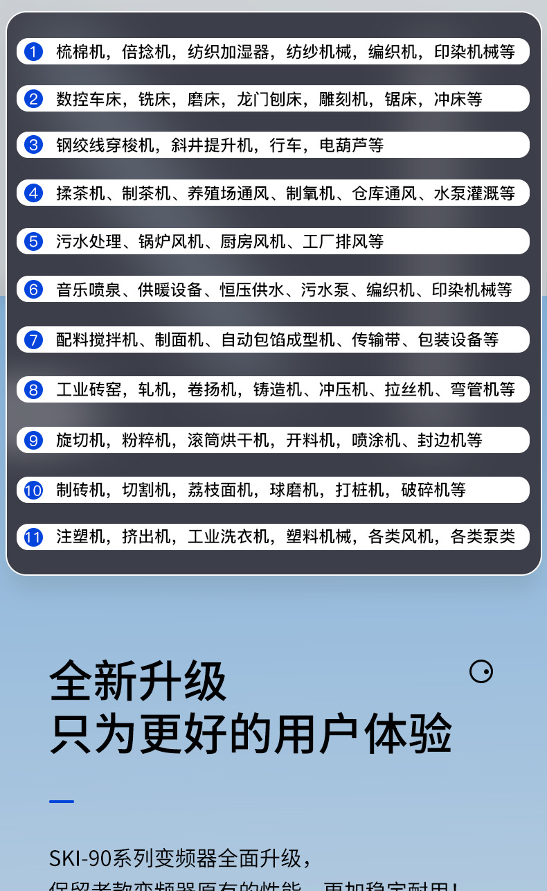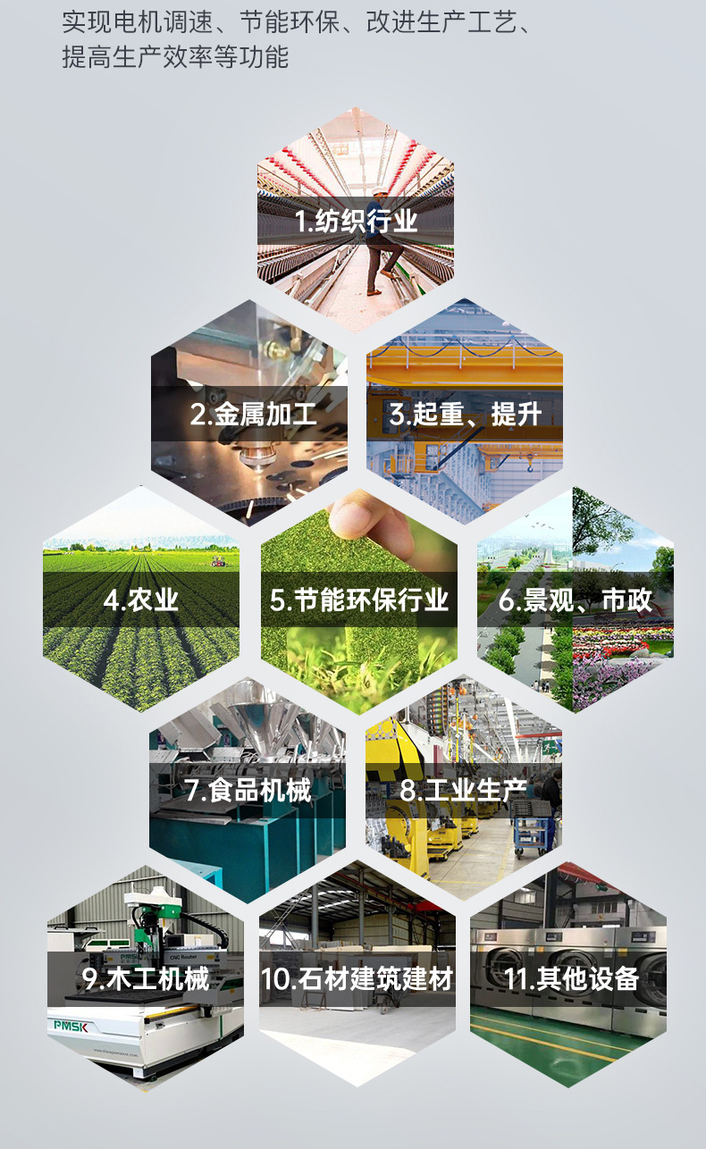 (廣泛應(yīng)用于冶金、鋼鐵、采油、礦山、建材、制藥、化工、造紙、塑膠、機(jī)床、紡織化纖、市政供水、暖通供暖等所有使用三相異步電機(jī)的行業(yè));