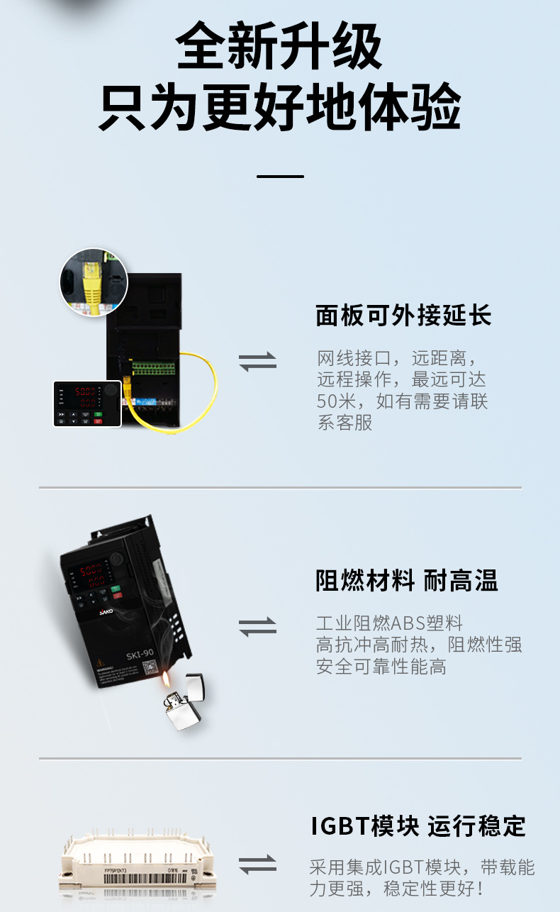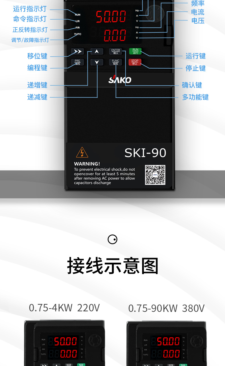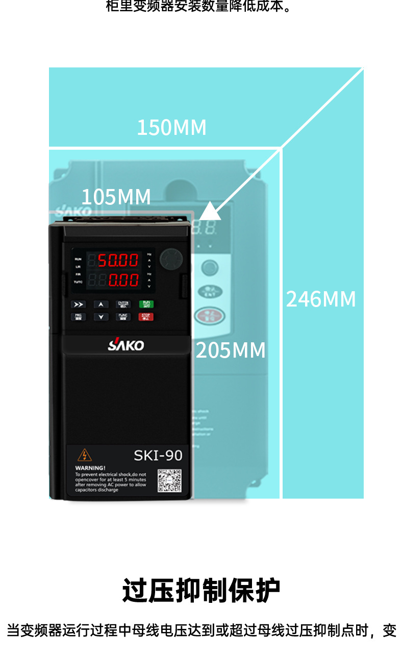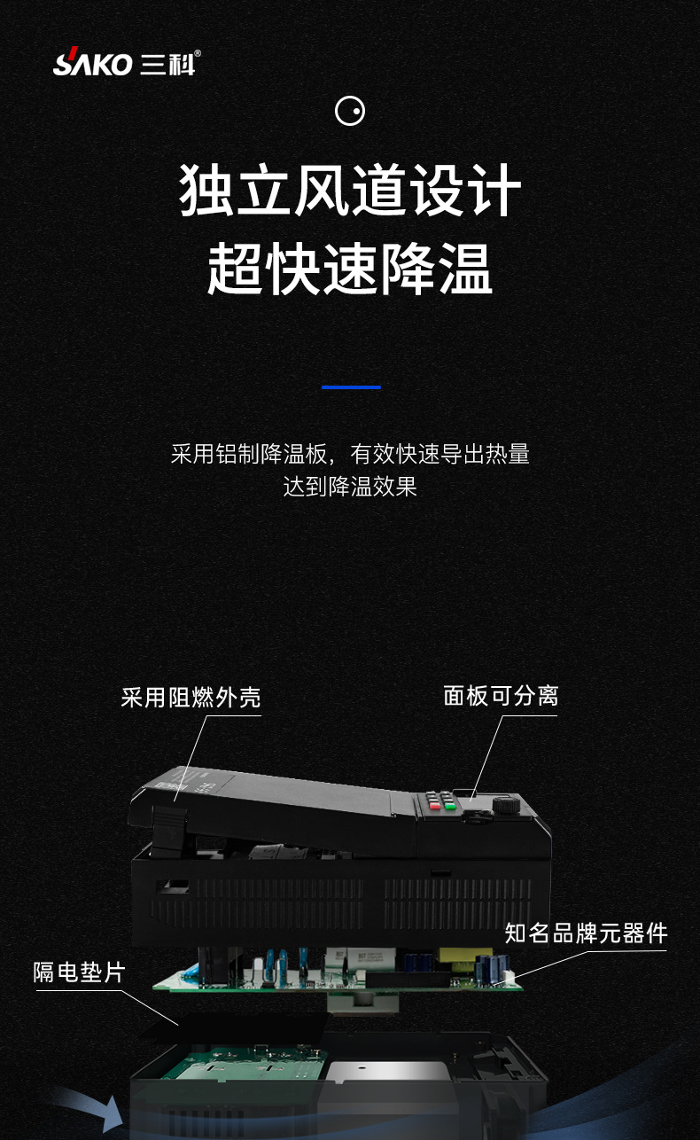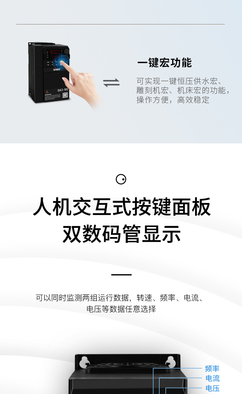 模塊機(jī),體積小,功能強(qiáng)大,市面上超過98%的變頻器都可替換使用,纖細(xì)外觀,內(nèi)部全新升級(jí),設(shè)計(jì)更緊湊,空間更節(jié)省更節(jié)約安裝空間,增加機(jī)柜里變頻器安裝數(shù)量,有效降低成本,雙排LED超清顯示,面板可外接延長。上下雙排都可顯示頻率,電壓,電流。