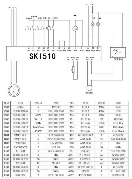 一,設(shè)計思路:選用一臺 15KW 具有 PID 功能的變頻器,可以不考慮輸入電抗器,電機(jī)速度由設(shè)定頻率與泵出口壓力作比較進(jìn)行 PID 調(diào)節(jié),設(shè)計應(yīng)考慮能手 /自動轉(zhuǎn)換。